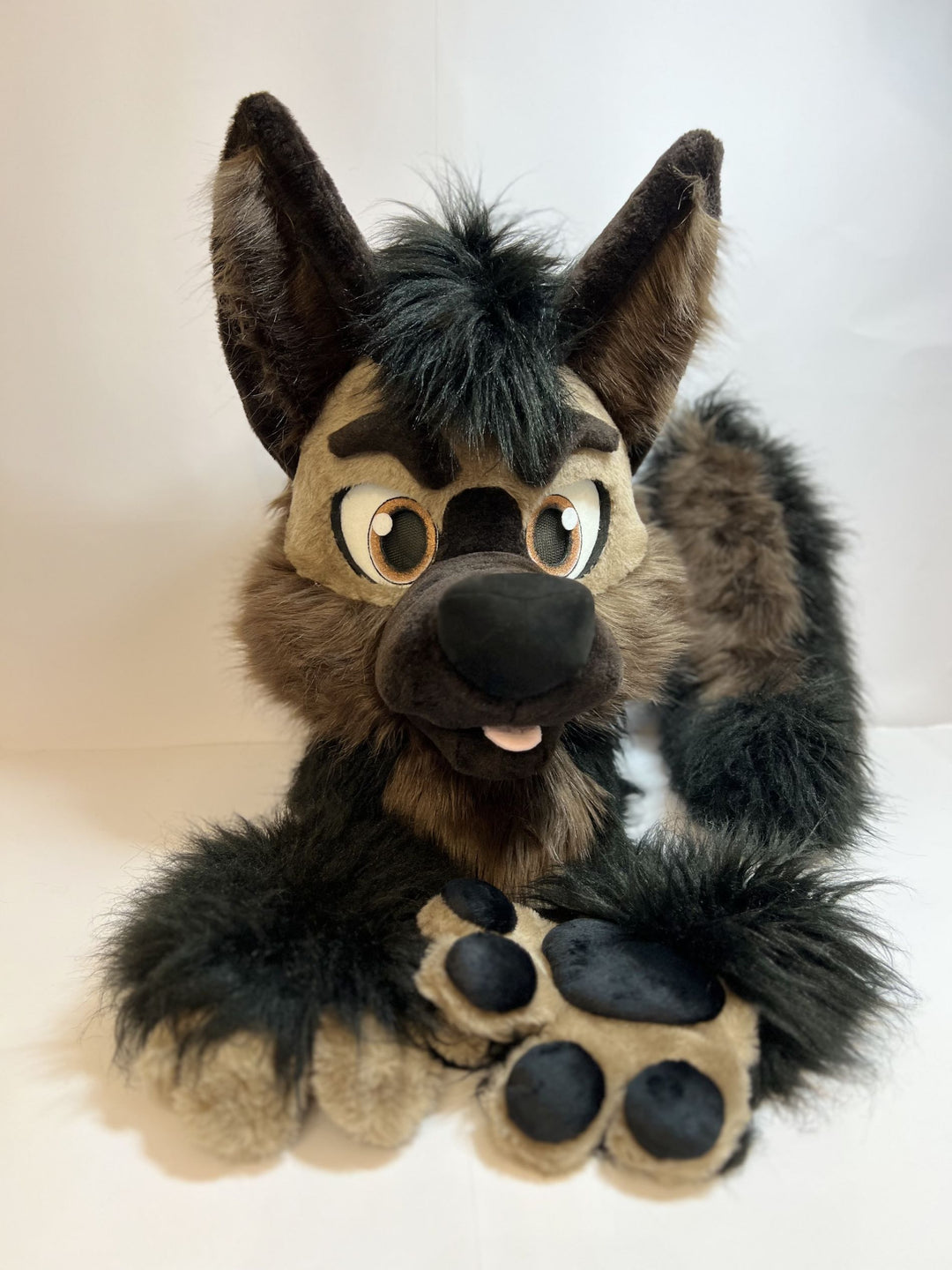Black airbrushed wolf fursuit head and hand paws for sale, black wolf furry suit